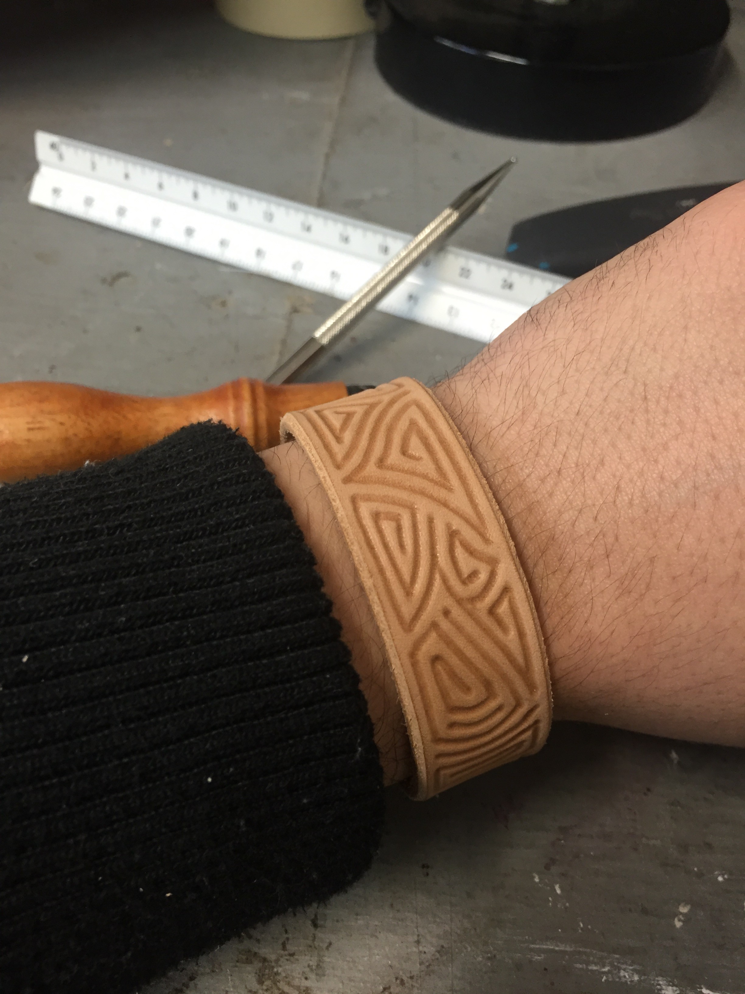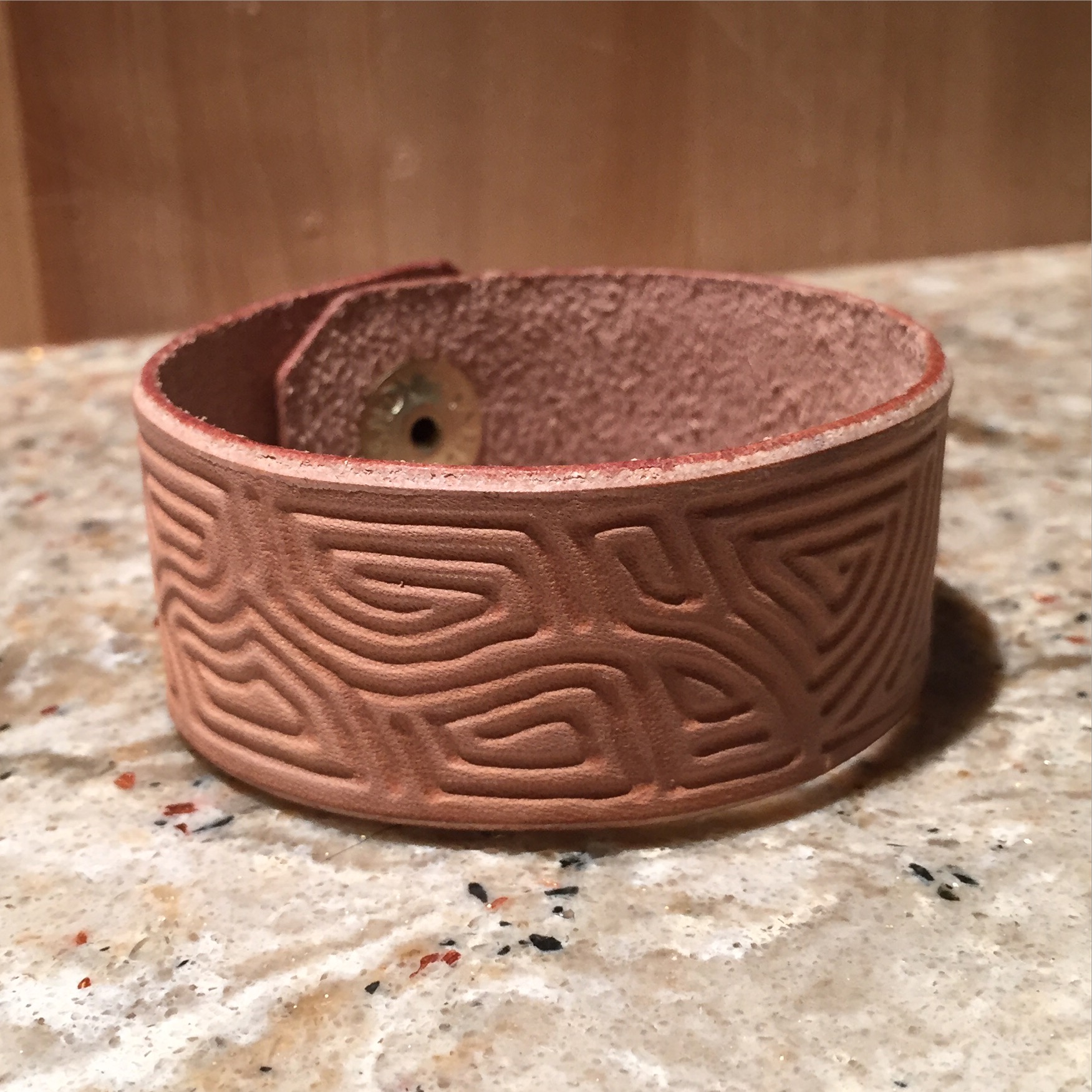 Traditional leathercraft has a very particular visual style - think of the ornamentation on a saddle or a pair of cowboy boots. I appreciate the aesthetic but have no interest in throwing my hat into that particular ring. It became a challenge, in the face of a craft with certain stylistic expectations, to find a means of surface decoration that was almost entirely outside of those expectations. How-to materials, beginner's tool sets, and even websites operate under the assumption that a new entrant to the field is aiming squarely at a traditional visual language. Thankfully, after a few remarkably pleasant trips to my local Tandy Leather and conversations with the employees, I found a way to recreate my ceramic carvings in leather. I quickly set about making some simple wearable pieces, feeling that decorative items of that sort were a natural place for this tooling style, and enjoying leathercraft's relatively low barrier to entry. I felt confident in a few core techniques right away - an invaluable way to maintain creative momentum.