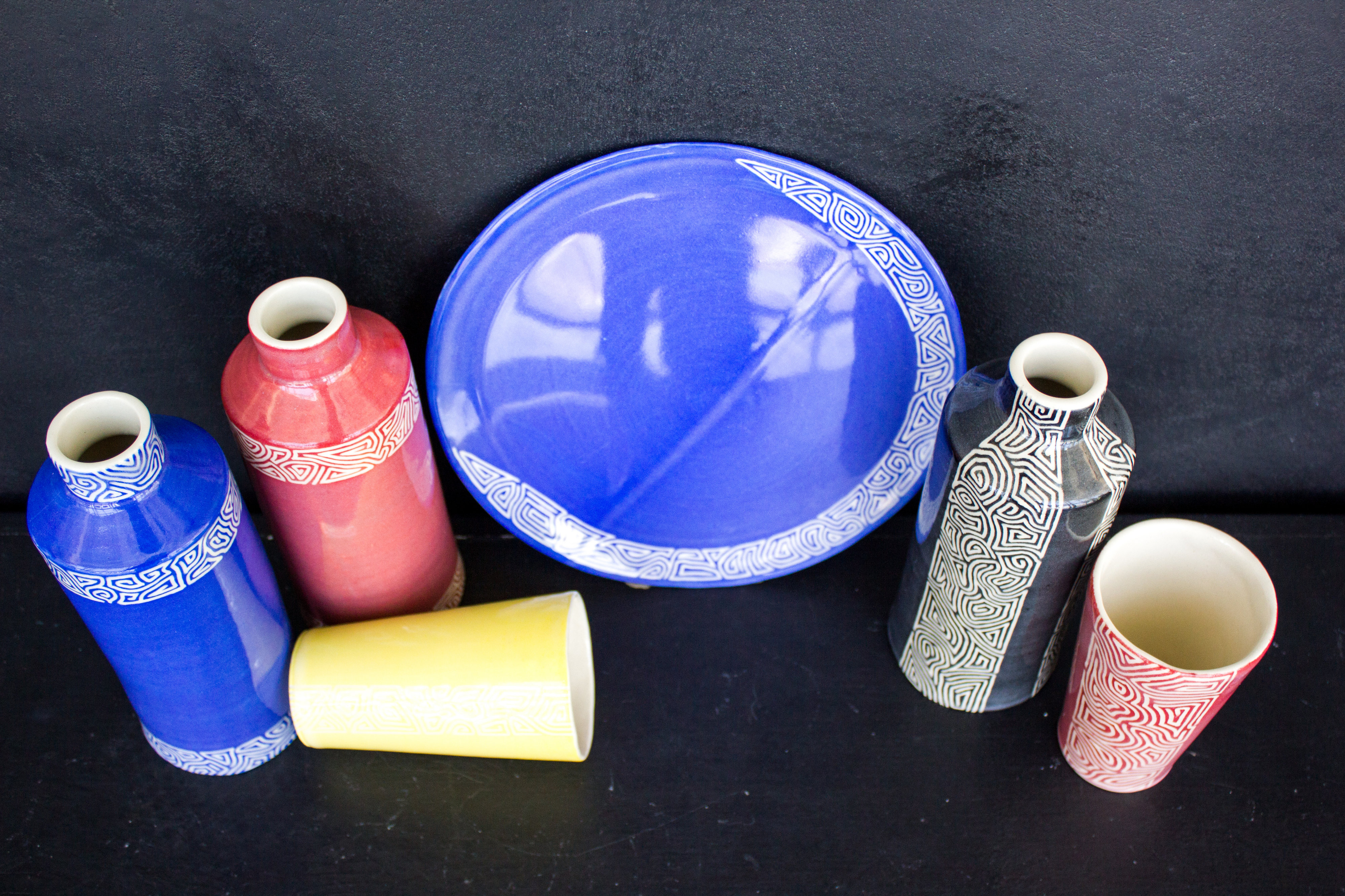 What I’ve done in No Mistakes In Jazz is give myself a structure to explore; I think of each different form as one might think of different songs, each with a different “solo” in the form of carvings, which are also informed by a simple color palette. And of course, there’s no one right solo for any song, so I decided to repeat forms and explore the possibilities of each multiple times. Obviously some may be more successful than others, but then, that discovery is the whole point. This concept was the inspiration for my use of slip casting instead of wheel throwing; slip casting provides a way to make multiples of a form consistently and reliably, and allowed me to truly focus on the carvings.